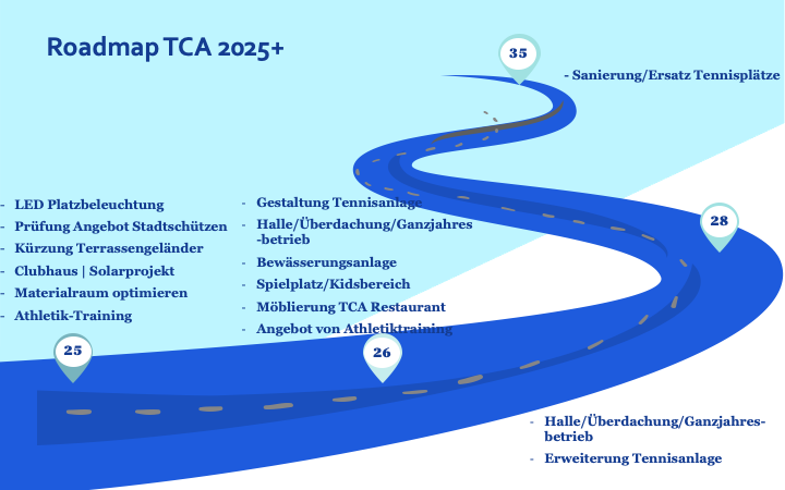 Wie an der TCA GV 2025 hat der TCA Vorstand die grösseren, anstehenden Projekte anhand der sogenannten TCA Roadmap 2025+ aufgelistet und priorisiert.